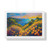 Floral Shore captures the meeting of bright fields and the open sea, drenched in vivid yellows and calming blues. The rich colors bring energy and light to any space. Available in white or walnut pinewood frames for a refined finish.