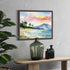 A framed watercolor of a tropical coast at sunset. Gentle hills meet the calm sea, with soft sandy beaches and warm, light colors that bring a peaceful, relaxing vibe to any space.